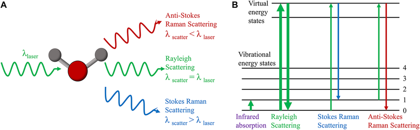 The two variants of Raman scattering is illustrated in the following figure.